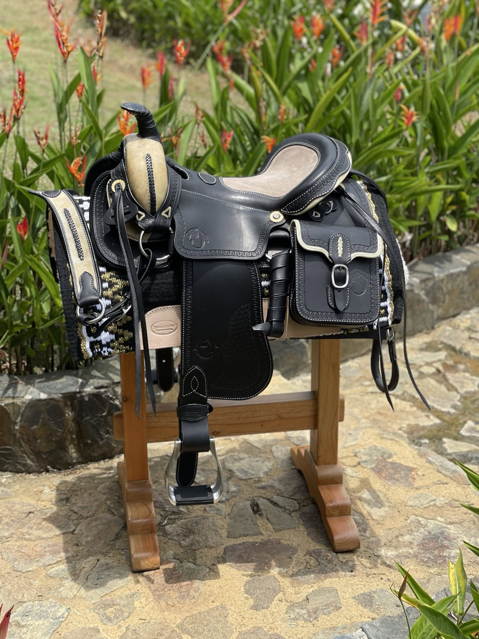 Al adquirir esta silla, obtendrás un producto con un diseño totalmente diferenciado en sus cortes y acabados. Su estructura está pensada en cortes redondeados, lo que le da un estilo fluido y elegante en cada pieza de cuero. Esta montura combina cuero negro con una pera extra grande en carnaza en color beige y un huevo en retobo, un detalle clave que aumenta la durabilidad en la zona de mayor contacto entre el jinete y la silla. Esto no solo prolonga su vida útil, sino que también evita un desgaste acelerado, garantizando comodidad y resistencia en cada cabalgata.
